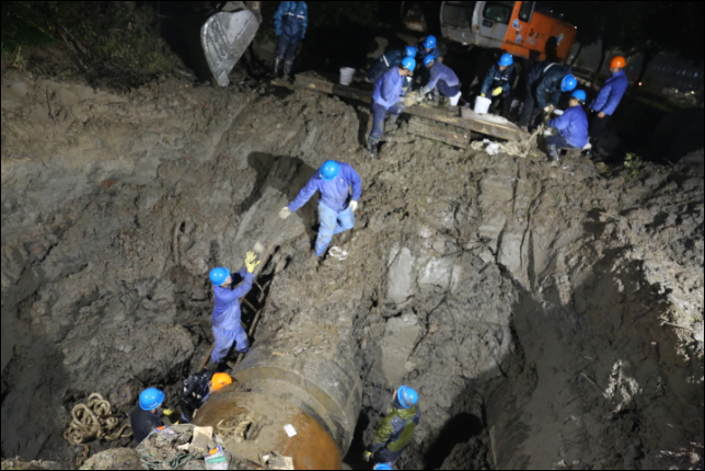 1月17日晚,绍兴柯桥滨海供水公司抢修人员在寒夜中冒雨抢修DN1000一期原水管。据了解,该管线位于兴滨路与越北路交叉口以南,是公司输送原水的重要管线,公司根据工业区供水情况,在不影响企业用水的前提下展开抢修工作,经过开挖、电焊等工序,连续工作12小时后,直至晚上9点原水管抢修完成。